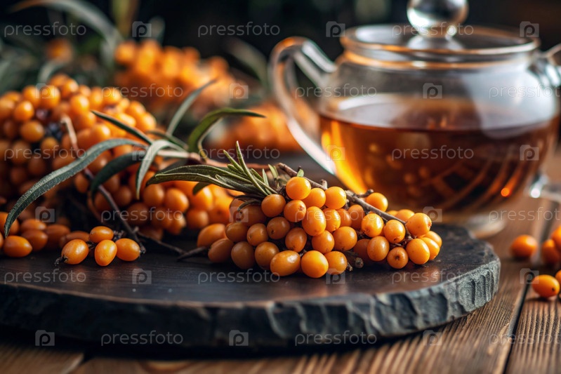 Здоровая, спелая ягода морского гречневого терна в ближайшем плане.Витамин, оранжевый, осенний, сезонный чай из ягод морского гречневого терна на темном фоне.Яблочный чай для иммунной системы