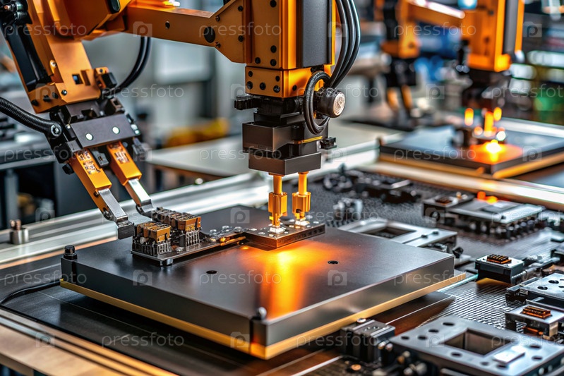 Автоматизированное производство электронных устройств. Современные роботизированные манипуляторы на сборочной линии чипов и печатных платок на современном электротехническом заводе. Установка компонентов на доске
