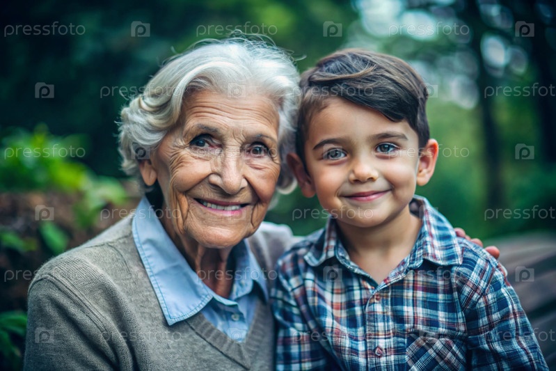 Счастливая семья, ребенок и бабушка обнимаются на улице в парке, счастливы и довольны