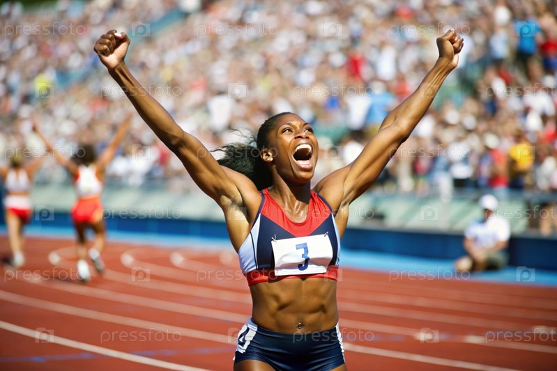 Афроамериканский чернокожий спортсмен побеждает во время спринтовой гонки или бега на спортивном мероприятии