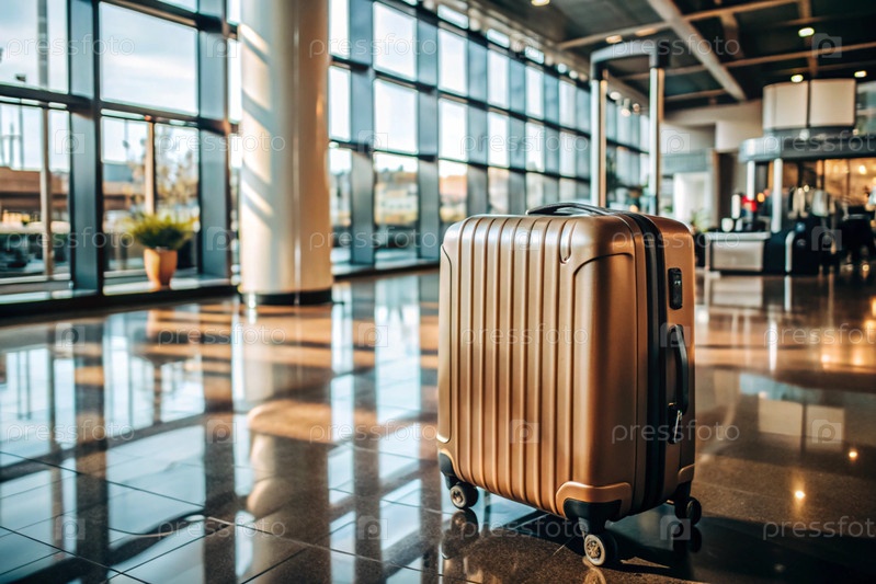 Чемодан в пустом аэропортовом салоне, сумки для путешествий в терминале вылета, концепция летнего отдыха, пространство для текста или дизайна
