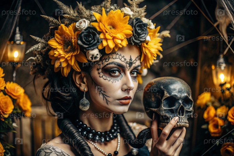 Концепция Хэллоуина. Ужасно. Костюмированная вечеринка. Красивая женщина с покрашенным черепом на лице и цветами на голове. Баннер, открытка