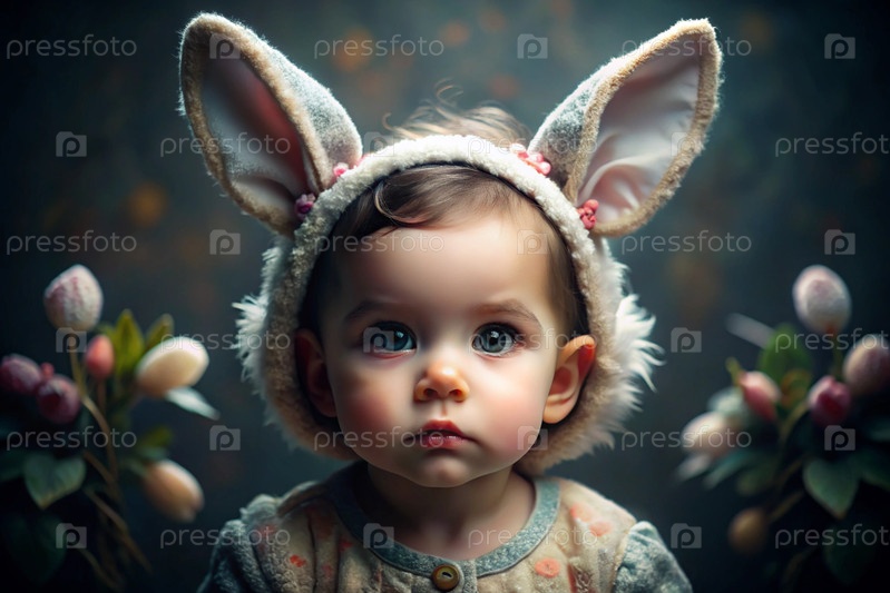 Баннер. Винтажная открытка. Девушка в костюме пасхального кролика с милыми ушами. Концепция праздника Bright Easter Spring