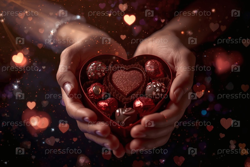 Руки женщины с подарком в форме сердца с шоколадом на День святого Валентина