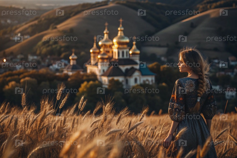 Молодая девушка в льняном платье на фоне поля спелых золотых пшениц и православной церкви при закате солнца