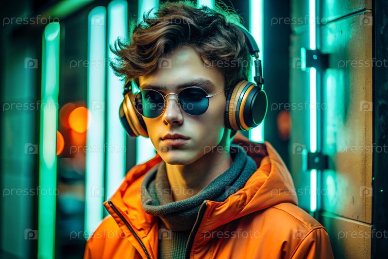 Молодой красавец в солнцезащитных очках слушает музыку на больших беспроводных наушниках, стоя среди неоновых вывесок