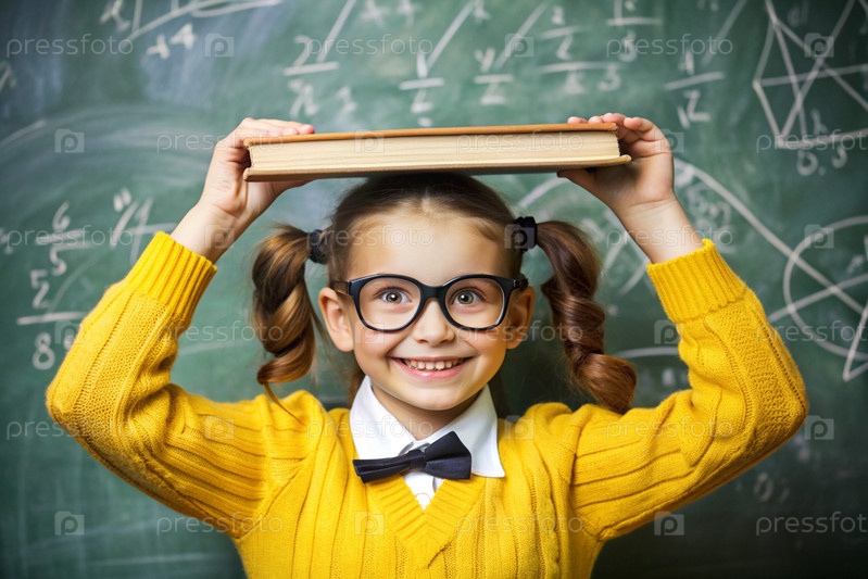 Красивая девушка с очками и книгами на голове. Ребенок впервые идет в школу. Ребёнок в классе со доской на заднем плане. Возвращение к школе