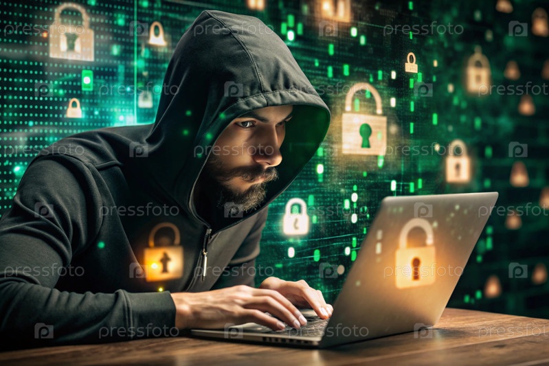 Хакер работает на ноутбуке, цифровые коды на виртуальном фоне. взлом и защита онлайн-данных. цифровые технологии, разработка программного обеспечения