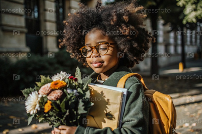 Красивая афроамериканка на очках с букетом осенних цветов впервые идет в школу. Ребенок со школьной сумкой, книгой и цветами. Малыш на городской улице