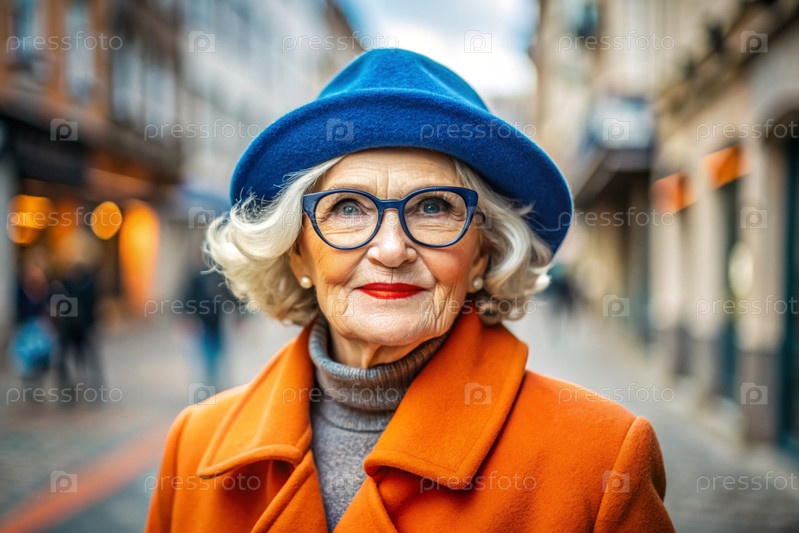 Портрет стильной, модной пожилой женщины, 70-летнего пенсионера на городской улице с очками и ярко-оранжевым пальто