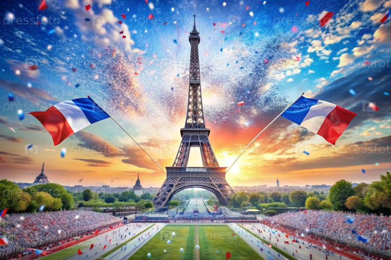 14 июля - Национальный день Франции. Государственный флаг Франции на Эйфелевой башне. Триколор. Концепция Олимпийских игр во Франции 2024