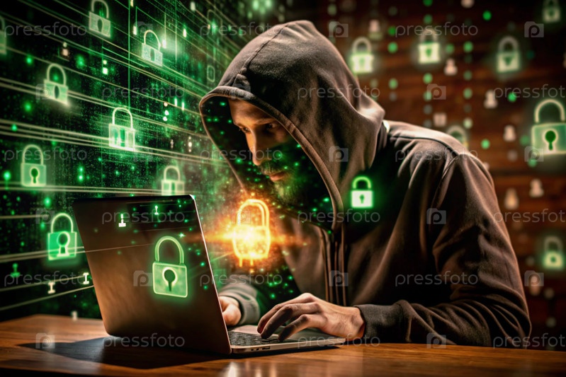 Хакер работает на ноутбуке, цифровые коды на виртуальном фоне. взлом и защита онлайн-данных. цифровые технологии, разработка программного обеспечения