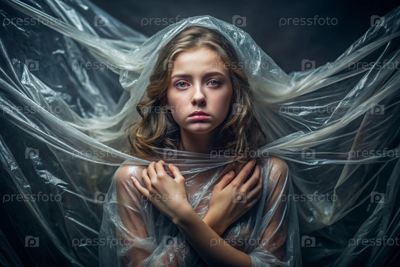 Девочка завернута в целлофан или сумку. Девушка задыхается. Пластиковое загрязнение планеты. Опасность для окружающей среды. Сокращение повторного использования пластика. Переработка. Концепция мусора