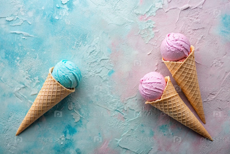 Баннер.Сладкий десерт.Конусы мороженого с разными вкусами.Голубое, розовое мороженое на фоне двух пастельных цветов: синего и розового