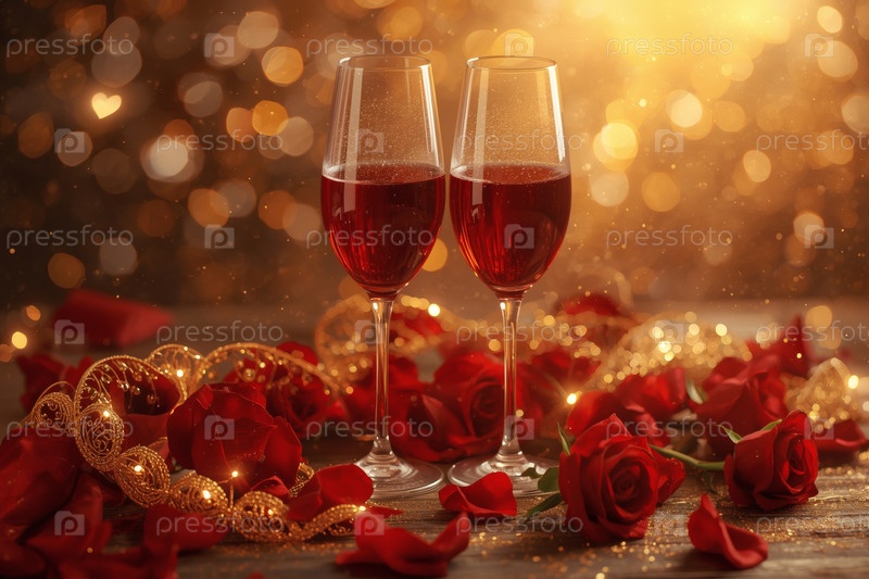 Концепция Дня Святого Валентина: два бокала красного вина, шоколад в окружении красных цветов и сердца на День святого Валентина