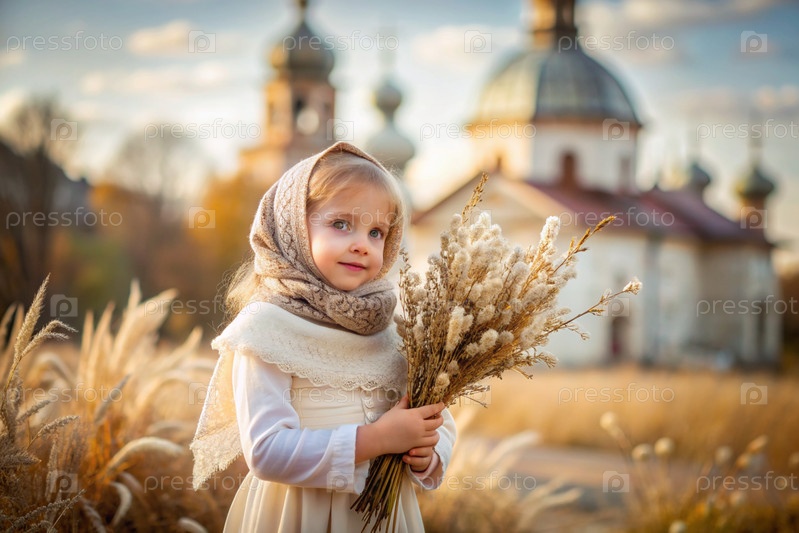 Портрет трехлетней девочки в русском народном шале с букетом дикой травы в руках на фоне православной церкви