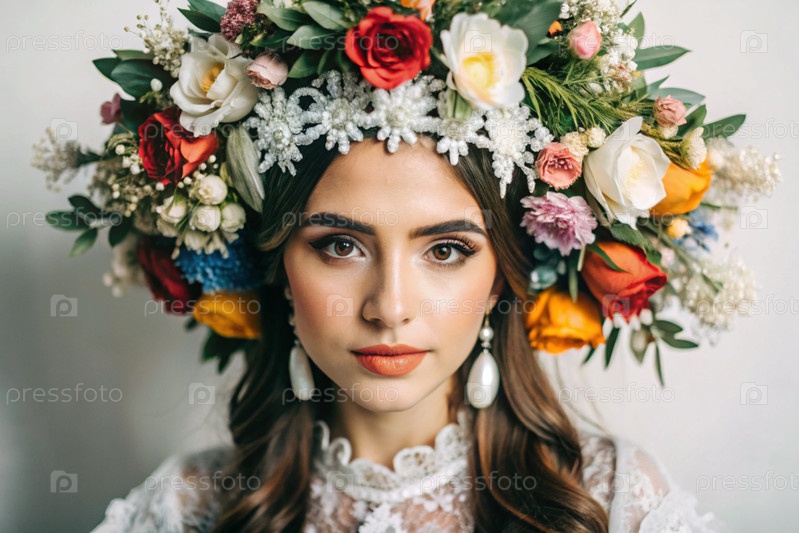 Портрет красивой молодой женщины в крупном плане с цветочной тиарой или венком на голове на белом фоне. испанская культура, латиноамериканское наследие