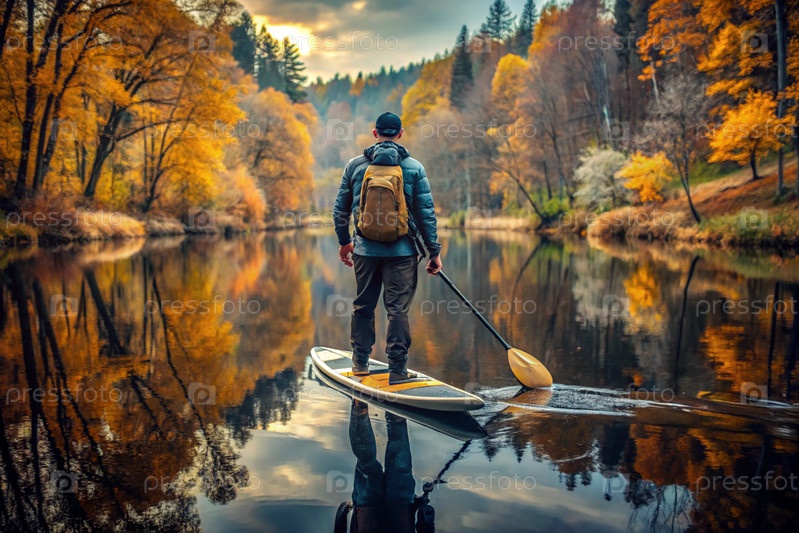 Мужчина-путешественник с рюкзаком на спине и веслом в руке плавает по реке на соковой доске посреди осеннего пейзажа