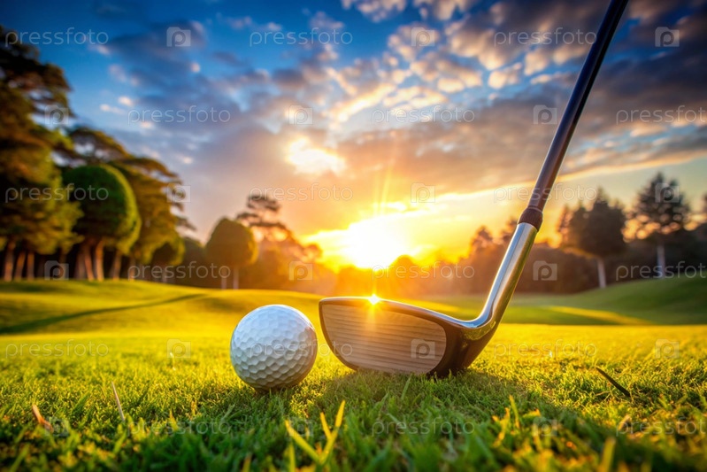 Баннер. белый мяч и металлическая клюшка для гольфа лежат на газоне в руках мужчины среди заката солнца. реклама матча по гольфу в кантри-клубе. свободное место для текста