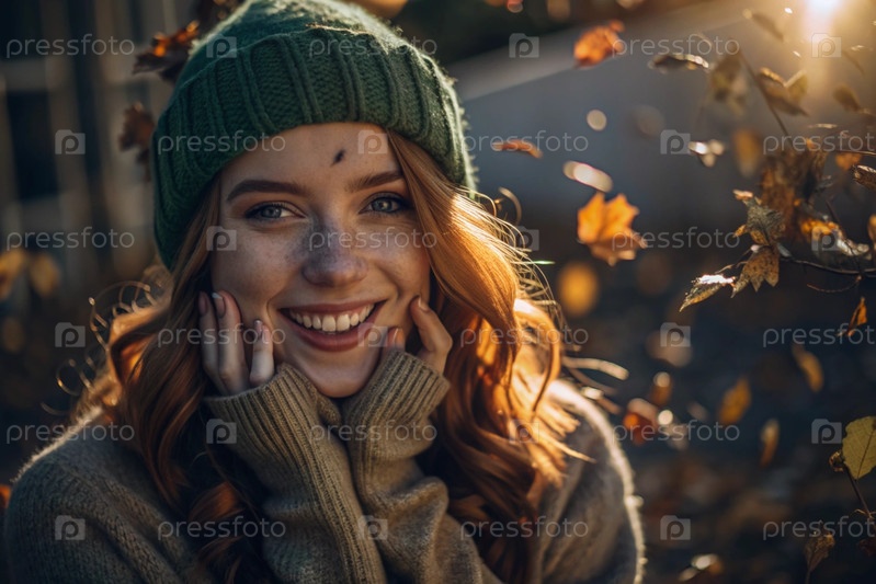 Осенний портрет. Близкий план молодой рыжеволосой женщины с ярко выраженными зелеными глазами в вязанной шляпе и свитере. Девушка смеется под лучами закатывающегося осеннего солнца