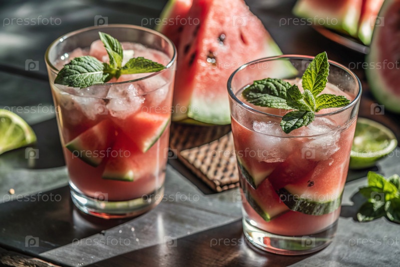 Свежий вкусный арбузный лимонад, мята, кубики льда и кусочки арбуза. летний освежающий напиток