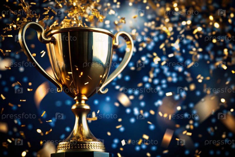 Вознаграждение. Золотая чаша и летающие конфетти на темно-синем фоне. Спортивные соревнования, успех, бизнес, концепция достижения и победы