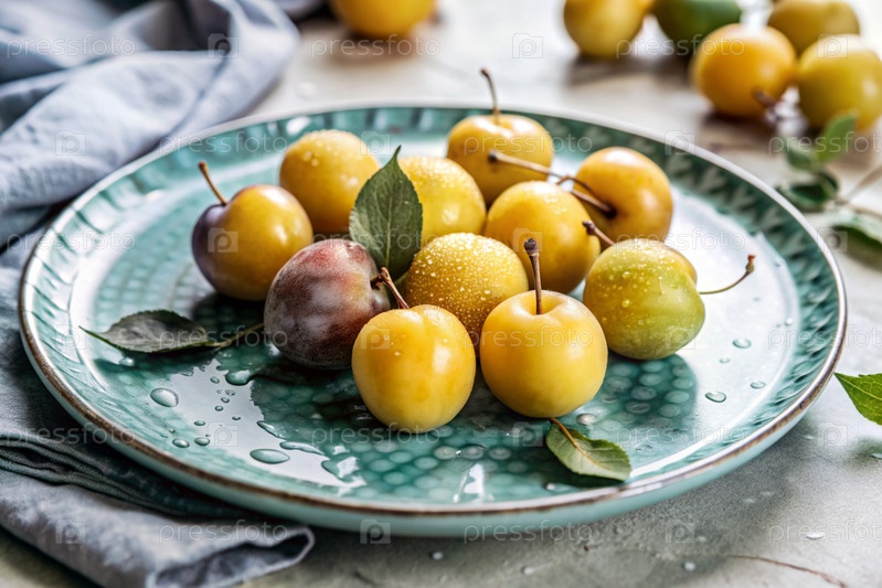 Закрытие свежих слив. Вкусные ягоды и фрукты ярко-желтого и фиолетового цвета с капельками воды. Вегетарианство. Здоровое питание. Свежие плоды на столе