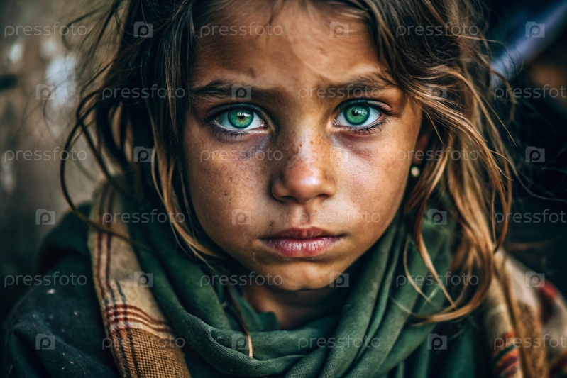 Голод, бедность.Портрет красивой грязной попрошайки с ярко выраженными синими глазами.Голодный бедный ребенок смотрит в камеру