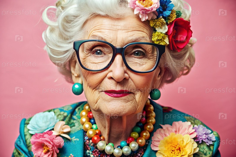 Портрет стильной, модной пожилой женщины, пенсионерки 70 лет, которая носит очки и одежду с цветочными оттисками