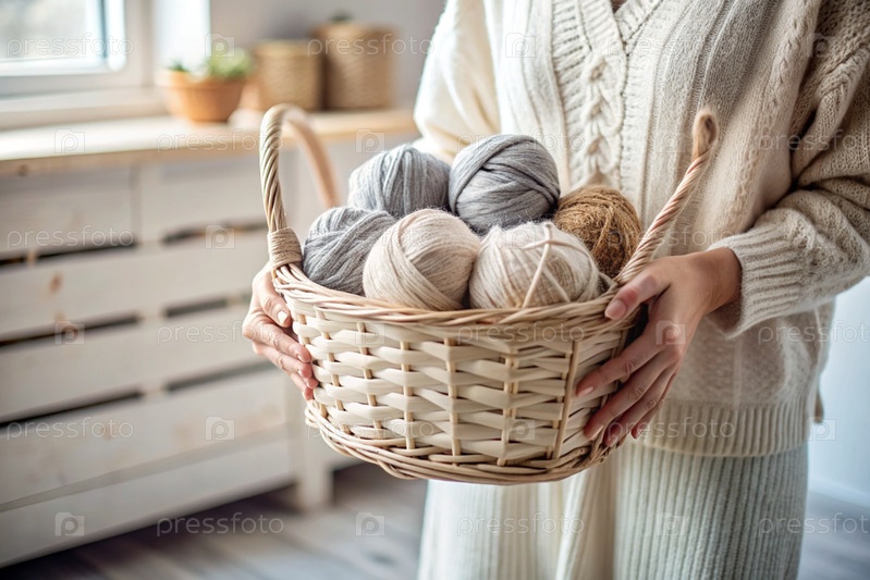 Близко. женщина с шариками пряжи в белых и бежевых тонах в руках. Игла, вязание. Зимний сезон, малый бизнес, ручная одежда