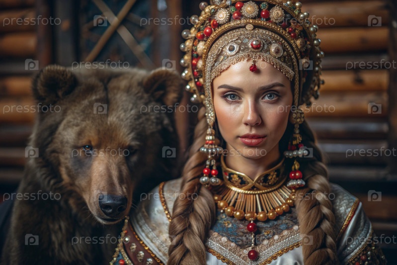 Красивая девушка в традиционном русском национальном костюме.Перед живым медведем.Портрет символизирует традиции и красоту русского народа