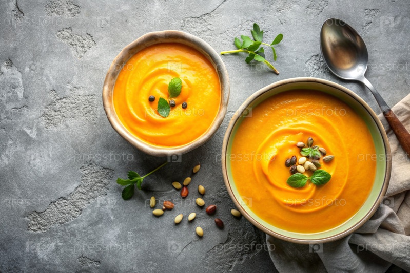 Традиционный мягкий тыквенный кремовый суп с сливками и семьями тыквы на сером бетонном фоне