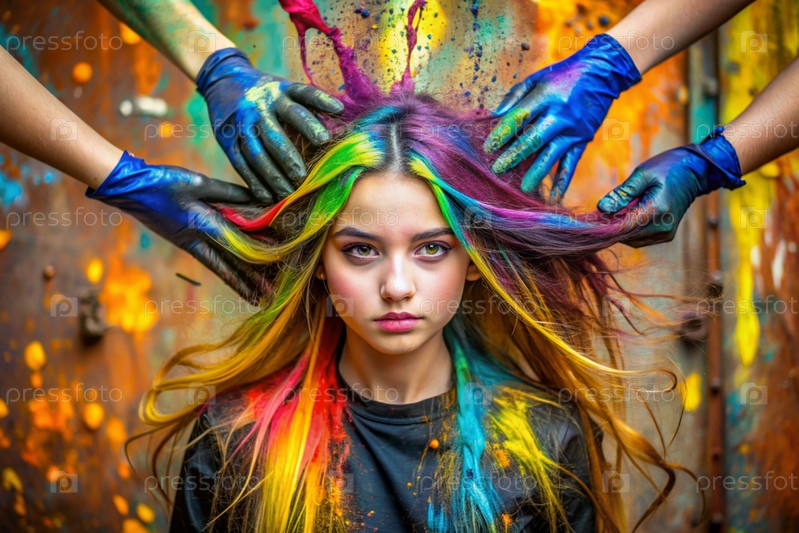 Творческий баннер для салона красоты или парикмахера. Модное профессиональное окрашивание волос. Красивая молодая девушка-подросток с длинными многоцветными волосами. Взрыв цветов на голове