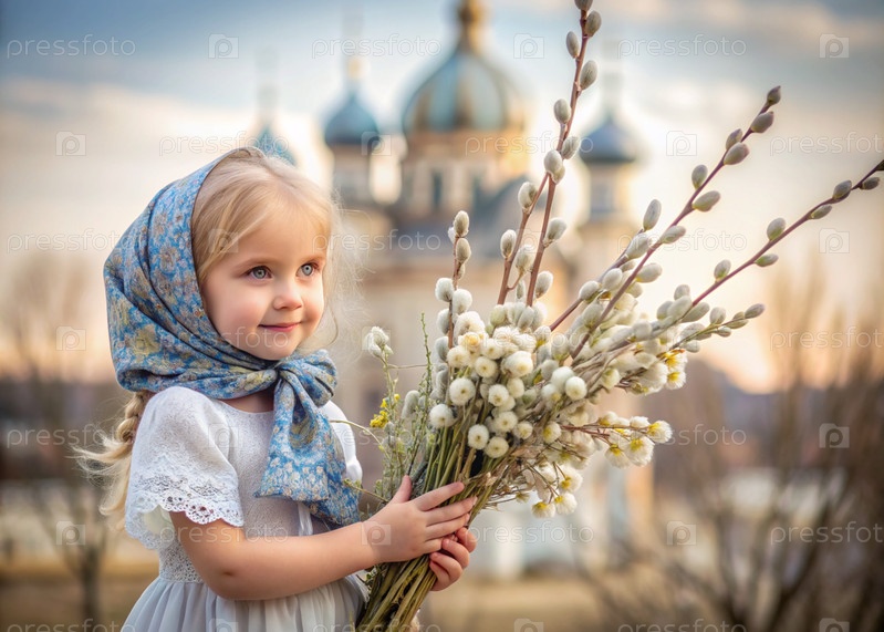 Неделя пальмовых деревьев. христианство. портрет трехлетней девочки в русском народном шале с ветвями ивы в руках на фоне церкви и заката