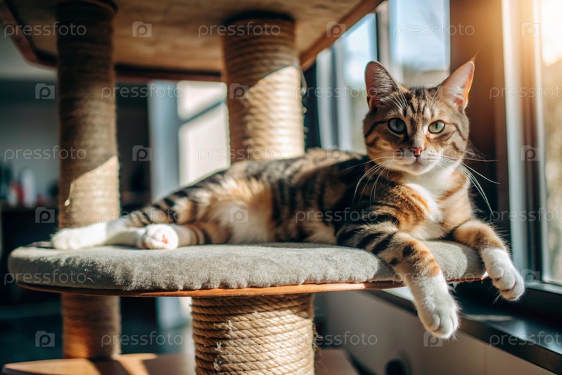 Животные.Кошка внутри дома на царапинованном столбе в солнечный день.Откормить кошку от разрыва мебели и обоев.Уход за домашними животными