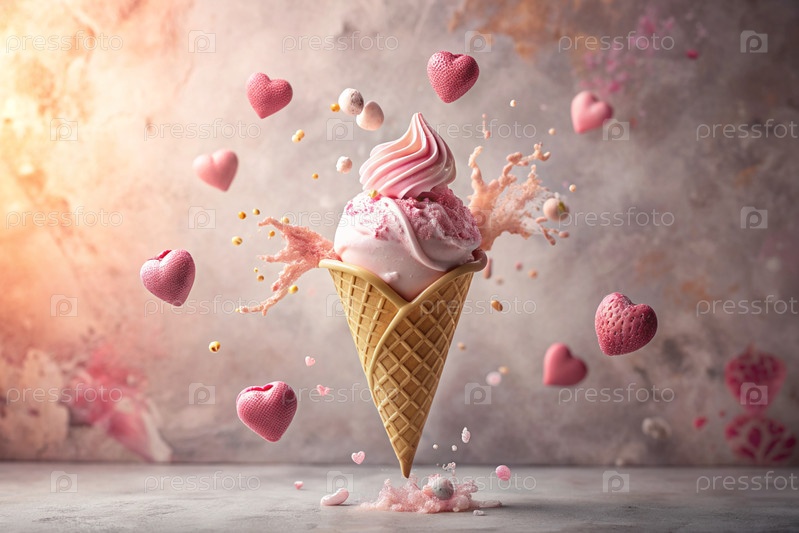 Сладкий десерт. Любовь к мороженому. Сердечно-образный конус мороженого с брызгами, сердцами и пятнами. Концепция Дня святого Валентина. Баннер, реклама