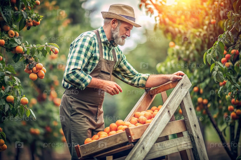 Сельскохозяйственная промышленность. Деревянный ящик с абрикосами в руках фермера-мужчины. Садовник собирает богатый урожай. Ближе, солнечный свет. Осенний урожай фруктов