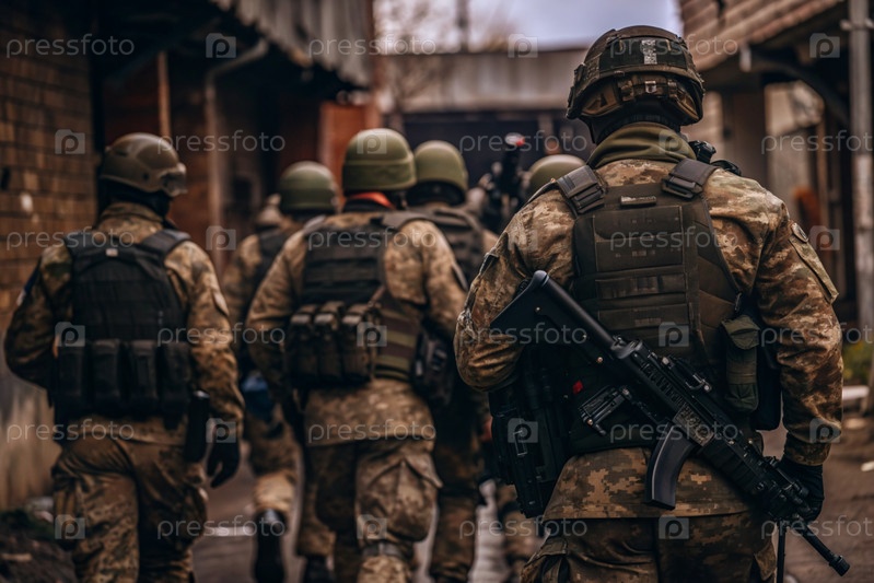 Военные действия.Солдаты элитного антитеррористического подразделения армии находятся среди разрушенных зданий.Очистите территорию врага