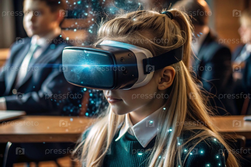 Девочка с очками виртуальной реальности. Ребенок находится в классе, а другие ученики на заднем плане. Цифровой интерфейс отображается в наушниках