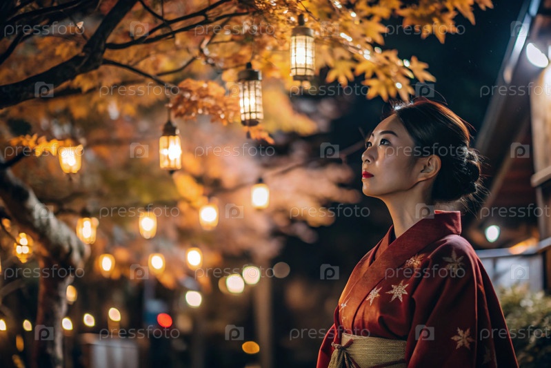 Японская девушка в традиционном национальном костюме - кимоно. На сказочном фоне фонарики и осенние деревья. Портрет символизирует традиции и культуру народа Японии