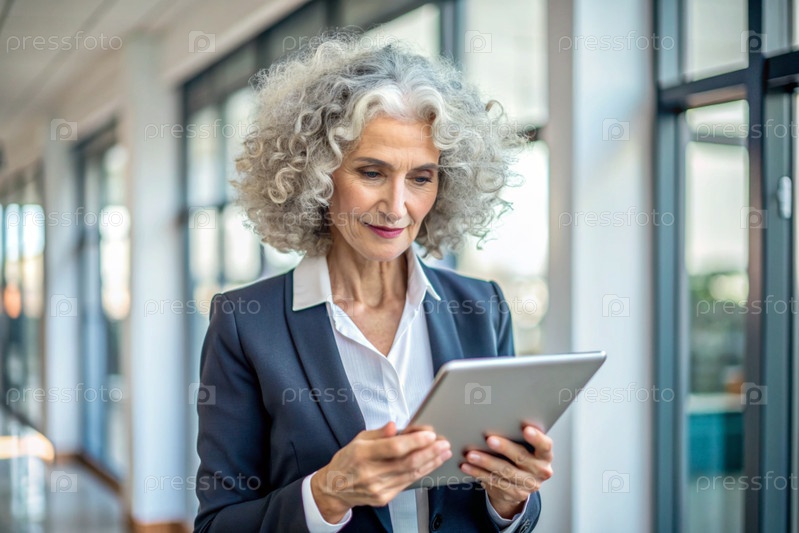 Деловая пожилая женщина с кудрявыми волосами. Она носит простую куртку. В руках таблетки. Бизнесмен смотрит на экран своего смартфона