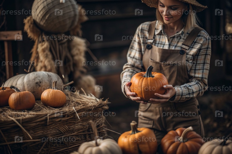 Руки женщины в квадратной рубашке с тыквенным крупным планом и красивым осенним рисунком. Сбор тыков. Концепция празднования Дня благодарения и Хэллоуина