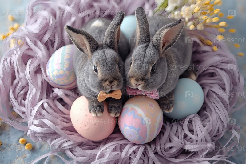 Пасхальные кролики лежат на пасхальных яйцах и смотрят в камеру