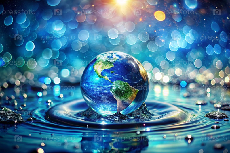 Концепция праздника - Всемирный день воды и День Земли.Планета Земля находится в чистой воде с капельками и брызгами.Красивый боке
