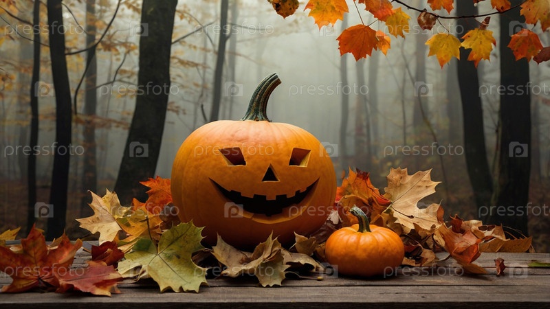 Осенний фон тыквы и осенние листья на фоне леса. Концепция Хэллоуина