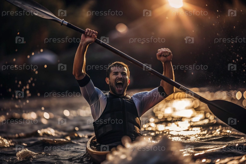 Каякер празднует свою победу с веслом в руках на размытом речном фоне