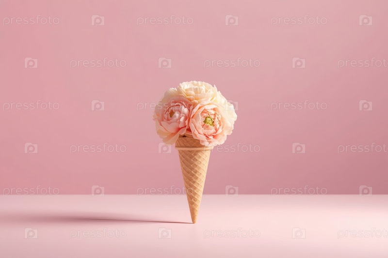 Минимальная студийная фотография. Вафельный конус. Наполненный тонкими пастельными цветами, напоминающими пионы или розы, с многослойными лепестками в мягких розовых и персиковых оттенках на розовом фоне