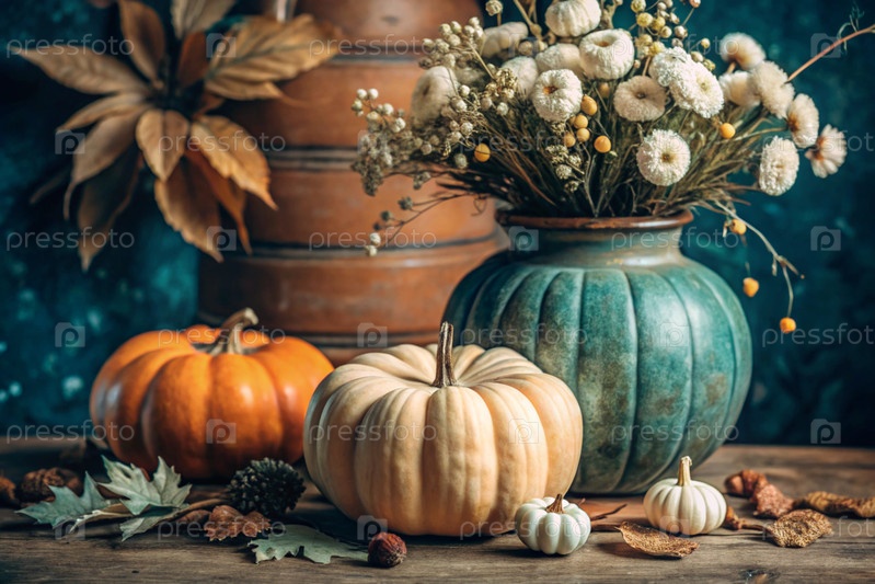 Букет цветов в керамической вазе и тыквы на деревянном столе у окна концепция домашнего комфорта осенний декор для Хэллоуина