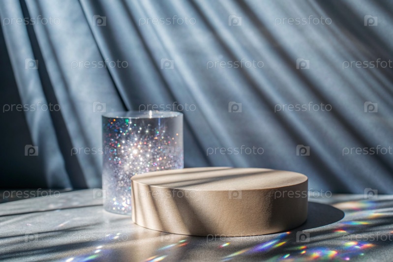 Пустой цилиндрический подиум со сверкающими кристаллами при преломлении света на минималистическом фоне, стенд для демонстрации моделей косметики и товаров