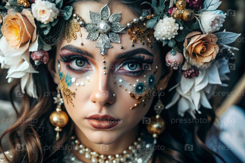 Портрет женщины с красивым макияжем, блестящими элементами, рисунками на лице и цветами в волосах